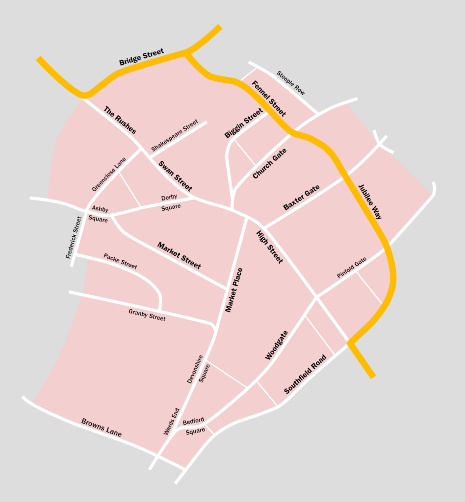 The Town Centre Crime Forum area covers Loughborough town centre, please see the map below for guidance. The streets included are: Ashby Square, Aumberry Gap, Baxter Gate, Bedford Square, Biggin Street, Cattlemarket, Church Gate, Churchgate Mews, Derby Square, Devonshire Lane, Devonshire Square, Fennel Street, Granby Street, Green Close Lane, High Street, Lemyngton Street, Market Street, New Street, Orchard Street, Pack Horse Lane, Packe Street, Pinfold Gate, Rectory Place, Shakespeare Street, South Street, Southfield Road, Swan Street, The Rushes, Wards End, Warners Lane, Woodgate.